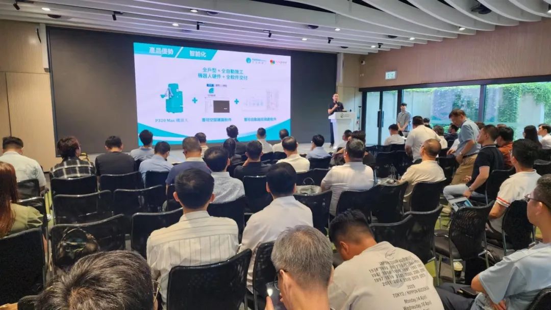 At the conference, Xu Anpeng focused on introducing Fulltime's innovative achievements and practical experience in the field of construction robots, particularly sharing the 卓越性能 (excellent performance) and innovative applications of Fulltime's self-developed star product – the spraying robot P320 Max. Targeting whole-house intelligent construction, the P320 Max is specially designed for indoor coating construction scenarios under 3.2 meters in height, widely applicable to various spaces such as residences, apartments, and hotels. It comprehensively covers complex construction scenarios like walls, ceilings, corners, bay windows, and corridors, enabling whole-house automated putty and latex paint spraying construction.