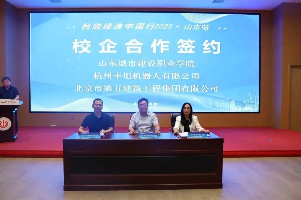Subsequently, Shandong Urban Construction Vocational College signed a tripartite cooperation agreement with Hangzhou Fontan Robot Co., Ltd. and the Fifth Company of Beijing Construction Engineering Group. Relying on their respective advantages in talent training, product research and development, and engineering practice, the three parties will jointly build an industry-university-research cooperation base for intelligent construction, and explore a three-stage talent training model of "classroom + enterprise + construction site".